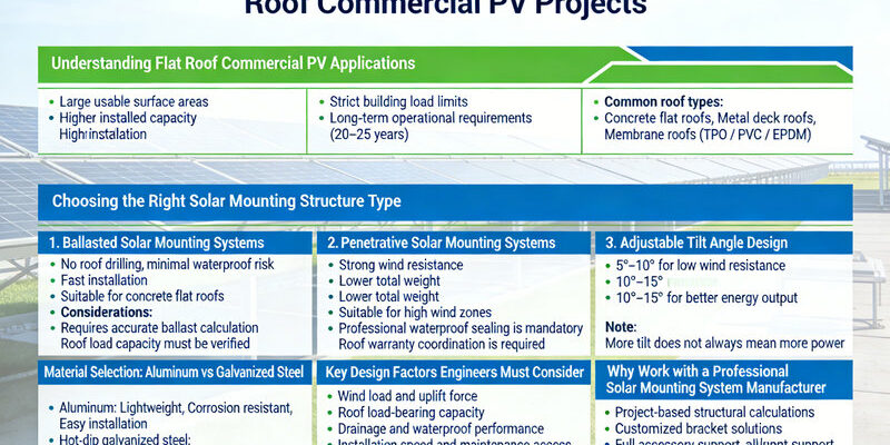 Designing solar mounting systems for flat roof commercial PV projects requires more than standard brackets. From roof type and mounting method to material selection and tilt angle optimization, every decision affects long-term system safety and ROI.